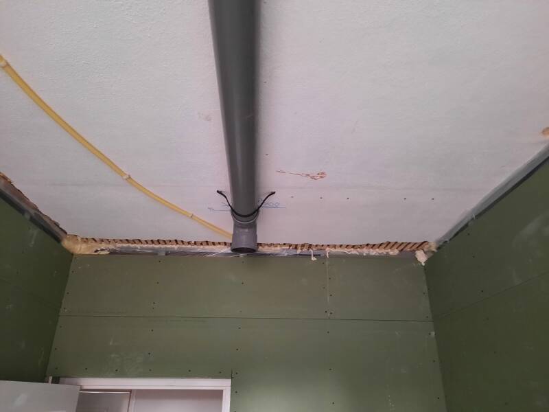 Afvoer t.b.v dubbele wastafel weggewerkt in metal stud voorzetwand.